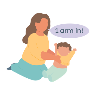 As you get them dressed, use simple phrases or sentences to describe what's happening: "1 arm in, 2 arms in", as you help with their t-shirt. This keeps it fun and helps them to learn the words for different body parts.