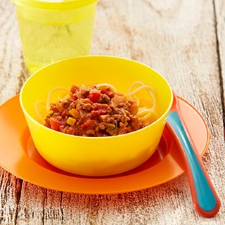 Put the pasta in a bowl, place quarter of the bolognese mix over the top and serve with a fork. Chop the meal if preferred.