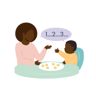 For example, you could count their food as you put it on their plate, like slices of banana: "1, 2, 3 – 3 slices of banana for you. 1, 2, 3 – 3 slices for me. That makes 1, 2, 3, 4, 5, 6 – 6 slices altogether!".