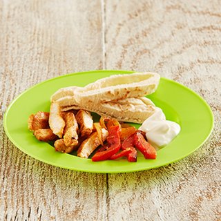 These chicken strips marinated and stir-fried with pepper and onions are a great introduction to spices for your baby. Serve with pitta bread strips. This recipe is great for older members of the family too – simply wrap up the fajita mix in tortillas.