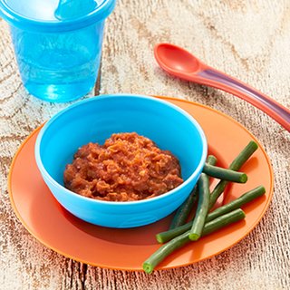Once cooled a little, blend or mash the goulash until smooth (but with soft lumps). Serve with the green beans as a finger food.