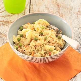 A super easy but interesting 1-pot meal using mixed vegetables, chickpeas, rice and curry powder. Can be enjoyed by the rest of the family too – just serve it as is, rather than chopping up.