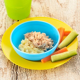 Once the potato is cooked, put 30g of the tuna mayo mix on top of the potato and serve with the vegetable sticks. If preferred, mash the meal up before serving.